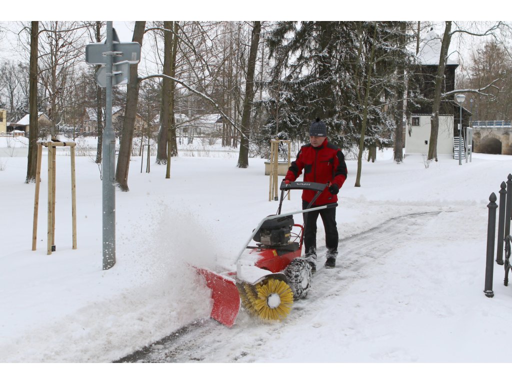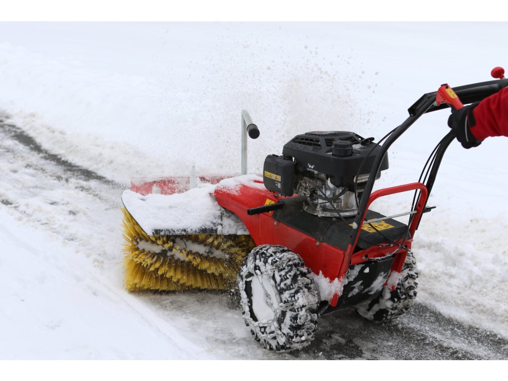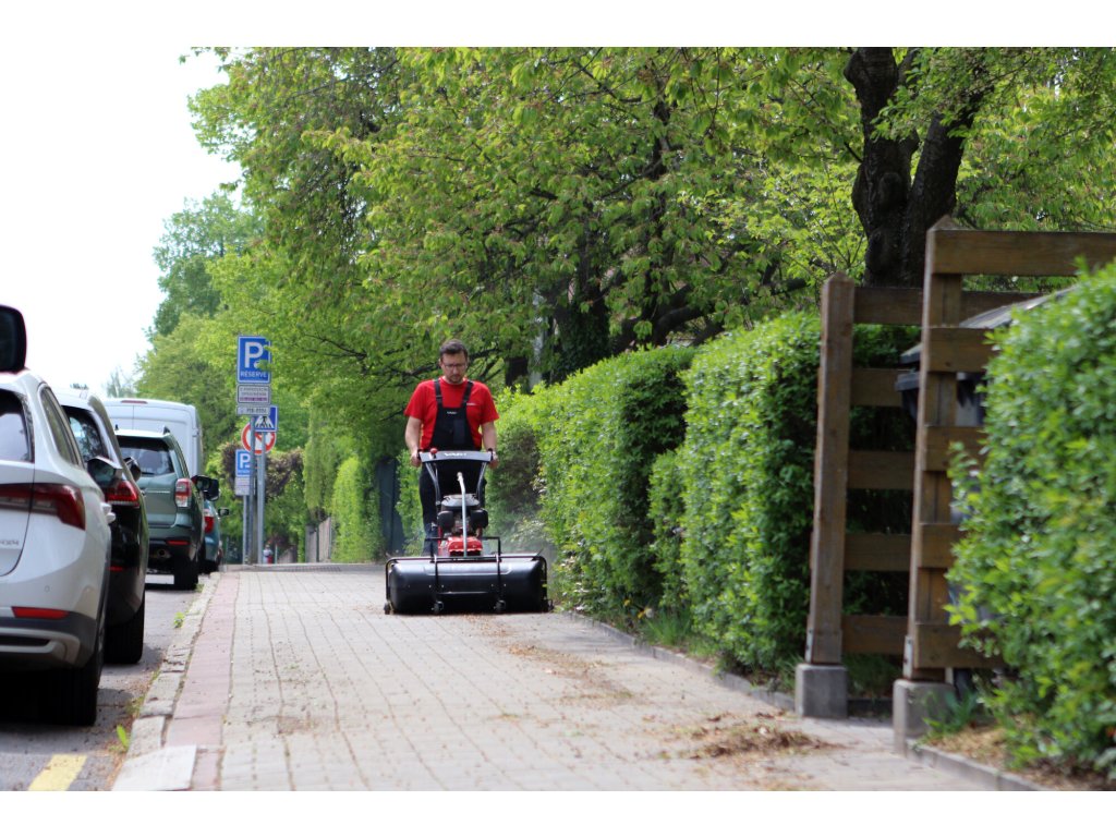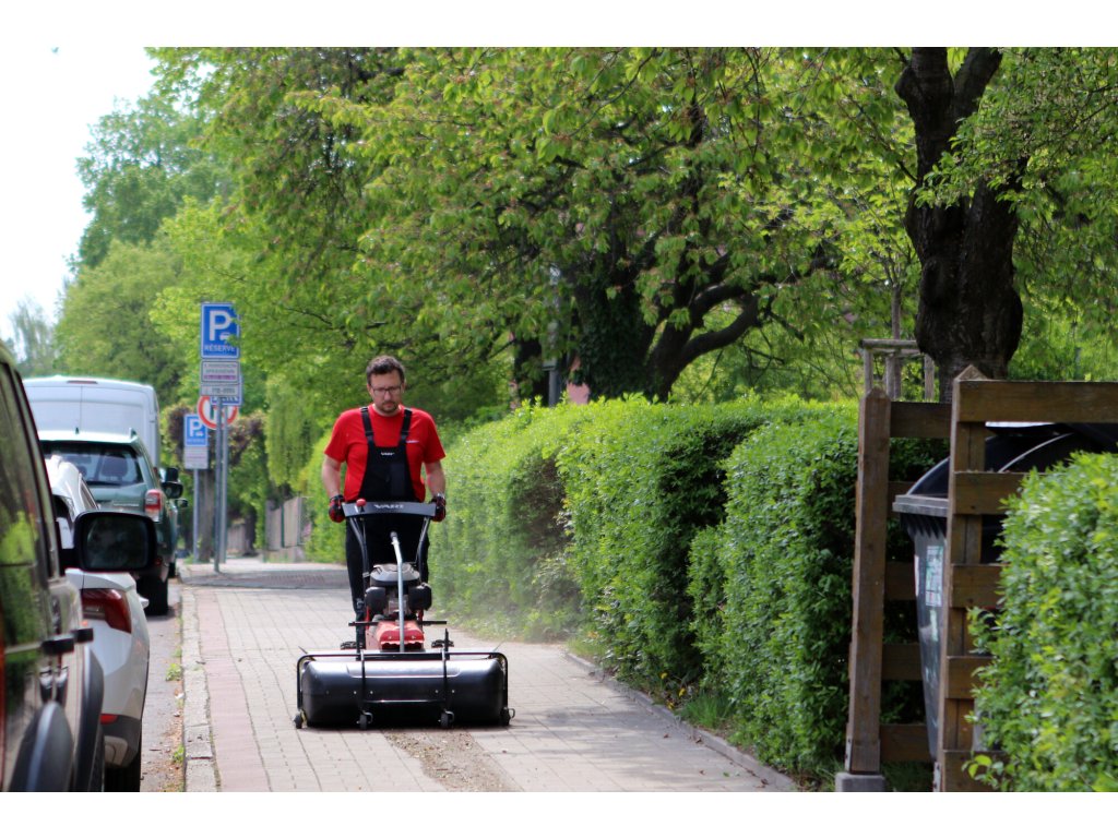Zametací válce se šíří záběru 100 cm a spirálovým uspořádáním štětin zajišťují vysokou účinnost zametání. Stroj je postaven na inovovaném šasi s řadou praktických detailů – například plynule nastavitelným přítlakem kartáče pomocí vodicího kola, snadnou výměnou zametacích válců nebo širším rozchodem kol, který zlepšuje stabilitu a umožňuje použití sněhových řetězů při zimním provozu.