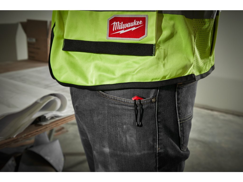 - Otvor na závěs nářadí pro snadné připevnění k bezpečnostnímu rámu Milwaukee, který usnadňuje použití ve výškách.