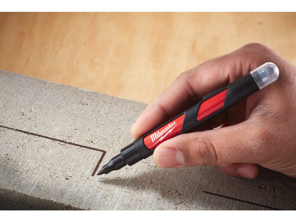 Značkovač Milwaukee INKZALL™ s jemným hrotem v černé barvě se stylusem umožňuje přesné psaní na většinu povrchů a rychle zasychá, takže se nerozmazává.
